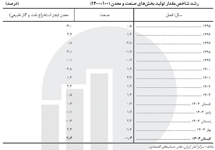رشد شاخص مقدار تولید بخش صنعت در تابستان سال جاری منفی ۰.۴ درصد بوده است. این شاخص برای بخش معدن (به جز استخراج نفت و گاز طبیعی) مثبت ۲.۶ درصد است.