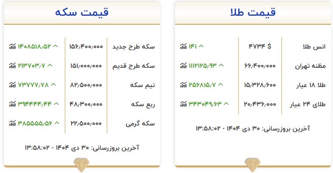 بر همین اساس بررسی آمار اتحادیه طلا و جواهر تهران از آخرین قیمت طلا و سکه در بازار داخل طی امروز -سه‌شنبه ۳۰ دی ۱۴۰۴- قیمت یک گرم طلای ۱۸ عیار نسبت به دیروز با ۱۸۰ هزار تومان افزایش به ۱۵ میلیون و ۳۲۸ هزار تومان و طلای ۲۴ عیار نیز با رشد محدودی به ۲۰ میلیون و ۴۳۶ هزار تومان رسید.