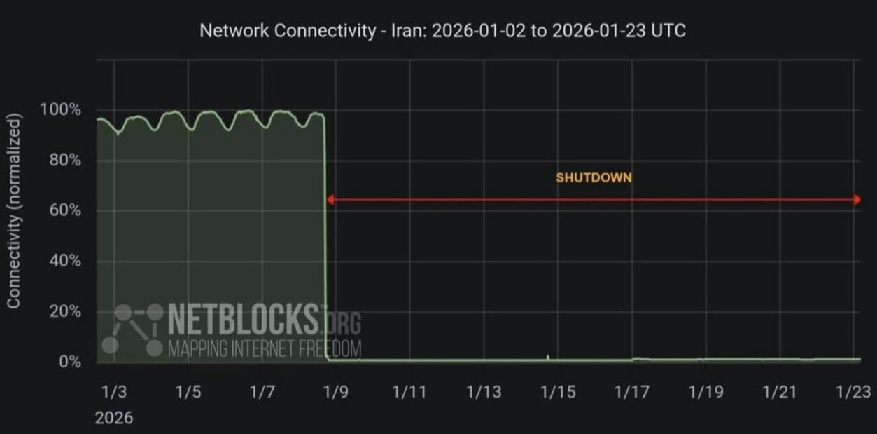 نمودارهای منتشر شده نشان میدهند که سطح اتصال (Connectivity) از تاریخ ۹ ژانویه ۲۰۲۶ (۱۹ دی ۱۴۰۴) با سقوطی ناگهانی از سطح ۱۰۰٪ به نزدیکی صفر رسیده و این وضعیت تا امروز، ۲۳ ژانویه، همچنان پایدار مانده است.