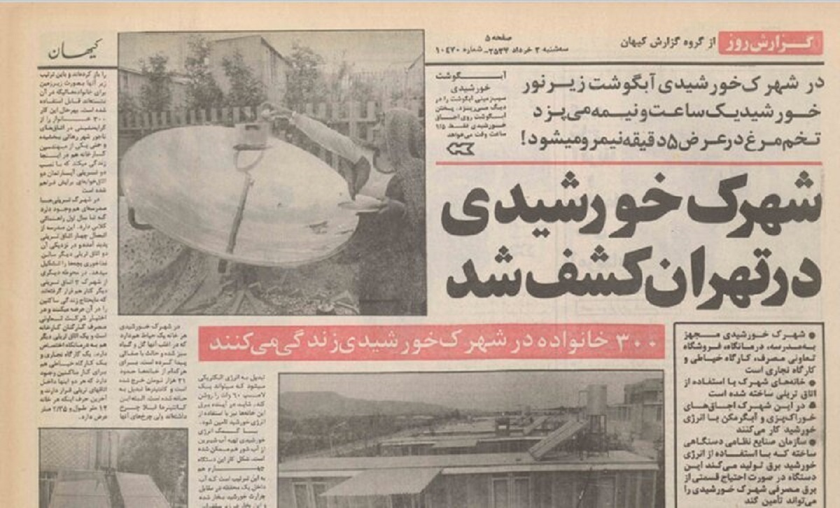 در بهار ۱۳۵۷ یکی از خبرنگاران کیهان، به شهرکی در شرق تهران برخوردند که ساکنان آن از آبگرمکن خورشیدی استفاده میکردند و غذای روزانهشان را با استفاده از انرژی خورشیدی میپختند. در حیاط هر کدام از خانههای آنان اجاقهای خورشیدی نصب شده بود که میتوانستند کلهپاچه را در عرض یک ساعت و نیم در آن بپزند.